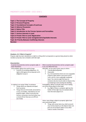 I used these detailed notes to obtain a high H1 of 87 in Property. These are the most detailed notes I have ever written. Topic 1: The Concept of Property Topic 2: Personal Property Topic 3: Foundational Concepts of Land Law Topic 4: Adverse Possession Topic 5: Native Title Topic 6: Introduction to the Torrens System and Formalities Topic 7: Various Interests in Land Topic 8: Private Title to Land: Registration Topic 9: Private Title to Land: Unregistered & Equitable Interests Topic 10: Priority Between Conflicting Interests Revision