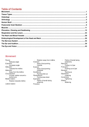 Everything you need to get a 7 in theory exams (with additional information to help apply your practical knowledge)! These notes cover topics from Weeks 1 to 13 (movements, tissue types, osteology, arthrology, the human skull, postcranial axial skeleton, muscles, phonation, chewing and swallowing, respiration, the larynx, the heart, blood vessels, embryological development, the nervous system, the ear and finally, the eye). With neatly presented tables classifying joints, muscle origins + insertions, and innervations, these notes will make your exams a breeze! Good luck :)