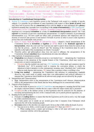 BENEFITS OF MY NOTES - These notes provide you with order and structure in how you approach problem questions. - You can just copy-paste the notes into your responses (or do some minor re-tweaking) and then apply your facts in sections that are highlighted. It really makes it that simple. - I have provided PINPOINTS as well having completed the readings and this will give you bonus marks in achieving that HD. - I promise you that these notes will the best set of notes that you will ever receive. I spent hundreds of hours perfecting these notes into these notes. MY GUARANTEE - This is what makes these sets of notes well worth the investment. Once you buy it I promise you that you will understand. LEGEND - Light Blue = Key principles - Pink = Case Names - Dark Blue = Legislation - Red / Bold = Anything Key to Note TOPICS 1. Trade and Commerce 2. Inconsistency 3. External Affairs 4. Corporations 5. Freedom of Interstate Trade 6. Taxation 7. Grants 8. Excise 9. Defence Power 11. Implied Freedom of Political Communication 12. Intergovernmental Immunities