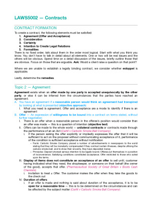 Comprehensive, easy to follow Contracts notes in a scaffold format. These notes are indexed and organised by topic, covering ALL topics, key cases and legislation. These notes help you structure the order of cases and shows you how one case builds on top of another, to create the nuanced web of contract law. Want to save time? Have a case which you don’t really understand? Save yourself from having to read many pages of judgements and re-watching lectures. Get all the key information that you need for cases just on these notes. ✓ Succinct ✓ Comprehensive ✓ Colour-coded for easy reading Get these notes now and help yourself in law school TOPICS COVERED Topic 2 — Agreement Topic 3 — Certainty Topic 4 — Consideration Topic 5 — Intention to Create Legal Relations Topic 6 — Formalities Topic 7 — Estoppel Topic 8 — Terms Topic 9 — Construction Topic 10 — Exclusion Clauses and Privity Topic 11 — Discharge by Performance and Agreement Topic 12 — Discharge/Termination for Breach and Repudiation Topic 13 — Discharge by Frustration and the Process of Termination