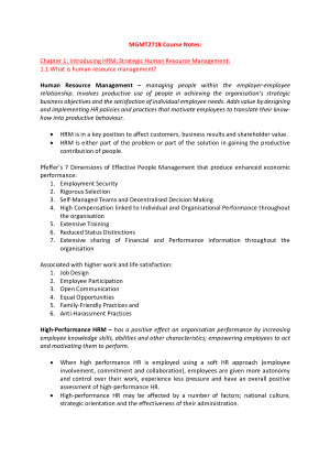 Course notes were taken from the prescribed textbook. Chapters Include: - Chapter 1: Introducing HRM: Strategic Human Resource Management - Chapter 2: Human Resource Planning - Chapter 5: Job Analysis, Job Design and Quality of Work Life - Chapter 6: Recruiting Human Resources - Chapter 7: Employee Selection - Chapter 8: Appraising and Managing Performance - Chapter 9: Human Resource Development - Chapter 10: Career Planning and Development - Chapter 12: Employee Remuneration - Chapter 17: Employee Health and Safety - Chapter 18: Managing Diversity