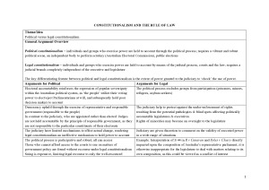 Structure: for/against arguments provided for potential essay topics across the entire course Topics covered: - Political versus legal constitutionalism - Was Australia legally independent at the time of Federation? - Is Australia legally independent now? - Representative and responsible government - Parliamentary sovereignty - Power of judicial review - Role of State versus Commonwealth - Utilizing treaties to overcome issues of issues of Indigenous sovereignty (Justice French) - Action to equalise the status of Aboriginal and Torres Strait Islander First Nations people under the Constitution - Changes elicited by the 1967 Referendum - How can Australia operate by popular sovereignty, when Imperial rule underpinned our constitutional foundations? - The strict constitutional interpretation of S 44 reinforces the dominance of legal constitutionalism in the Australian legal system.