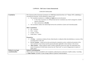 Full course content from LAWS1141 is summarised in table form: - Organised by topic - All cases - Legislation Topics covered: - Constitutionalism - Acquisition of legal independence - Constitutional Hybrid - Federalism - Parliamentary sovereignty - Popular sovereignty - Indigenous sovereignty - Indigenous people - Voting and the Constitution - Legislature (Federal) - Legislature (State) - Executive - Judiciary - Rights protection - Constitutional Change
