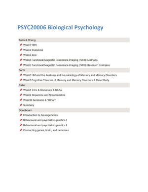 Hihi this has to be the most comprehensive notes for PSYC20006 you can find! Perfect for MCQ and definitely ideal for preview before semester and revision during the semester I made this whole thing in Notion and it really helped me a lot during exams I have included the full table of contents and part of EEG and Heredity in the Sample The main features of this note that other notes do not have: - During the semester I have grouped things in toggle lists based on relevance so that in this PDF file you can see everything clearly without feeling confused by overwhelming paragraphs - Since I have no science background, I have written down relevant resources I researched online to help me understand certain concepts. So if you are just like me and wanna learn more about some biological or neuro concept, this is perfect for you as a preview before the semester starts! Biological Psychology has been a really difficult subject for lots of people. Mainly because students often do not understand everything clearly but just read slides. Hope you would find this note with explanation and categories helpful! Topics include: Bode & Cheng Week1 TMS Week2 Statistical Forte Week6 HM and the Anatomy and Neurobiology of Memory and Memory Disorders Week7 Cognitive Theories of Memory and Memory Disorders & Case Study Cater Week8 Intro & Glutamate & GABA Week9 Dopamine and Noradrenaline Week10 Serotonin & "Other" Goodbourn Week11 Part1 Introduction to Neurogenetics Week11 Part2 Behavioural and psychiatric genetics I Week12 Part1 Behavioural and psychiatric genetics II Week12 Part2 Connecting genes, brain, and behaviour