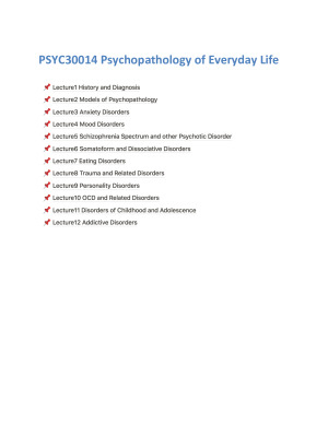 Hihi this has to be the most comprehensive notes for PSYC30014 you can find! Perfect for MCQ and definitely ideal for preview before semester and revision during the semester I made this whole thing in Notion and it really helped me a lot during exams I have included the full table of contents and part of different lectures in the Sample The main features of this note that other notes do not have: - During the semester I have grouped things in toggle lists based on relevance so that in this PDF file you can see everything clearly without feeling confused by overwhelming paragraphs - Since I have no science background, I have written down relevant resources I researched online to help me understand certain concepts. So if you are just like me and wanna learn more about some biological or neuro concept, this is perfect for you as a preview before the semester starts! This subject has been a really difficult subject for lots of people. Mainly because students often do not understand everything clearly but just read slides. Hope you would find this note with explanation and categories helpful! Topics include: Week1 History and Diagnosis Week2 Models of Psychopathology Week3 Anxiety Disorders Week4 Mood Disorders Week5 Schizophrenia Spectrum and Other Psychotic Disorder Week6 Somatoform and Dissociative Disorders Week7 Eating Disorders Week8 Trauma and Related Disorders Week9 Personality Disorders Week10 OCD and Related Disorders Week11 Disorders of Childhood and Adolescence Week12 Addictive Disorders