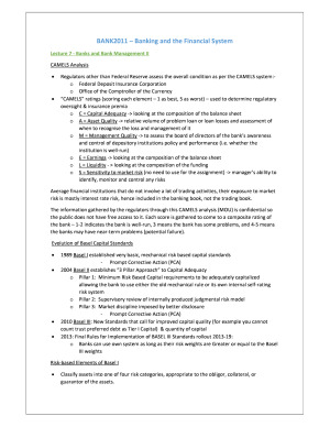Comprehensive and well-organised note based on lectures, tutorials and textbook. It covers content from weeks 7-12, in preparation for the final exam. Final exam requires in-depth understanding of the theoretical aspect as well as the calculation aspect. My notes include detailed description of the theoretical content from the textbook and thorough research work. I have also included step-by-step calculations for each type of calculation required. Received a High Distinction grade for the overall course mark. The contents of the notes are as follows (content from mid-semester exam to final exam): - Wk 7: Foreign Exchange Risk – Measurement and Management - Wk 8: Credit Risk - Corporate Lending and Credit Risk Estimation - Wk 9: Credit Risk - Individual Loan Risk - Wk 10: Credit Risk - Loan Portfolios and Concentration Risk - Wk 11: Credit Risk - Risk Management Techniques - Wk 12: Liquidity Risk - Measurement and Management - Wk 13: Bank Regulation - The Basel Capital Accord