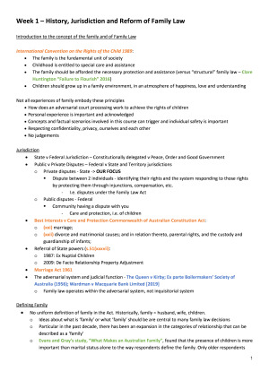Comprehensive and well-organised notes based on lectures, textbook and readings. Received a Distinction grade for the course. The content of the notes are as follows: - Class 1: HISTORY, JURISDICTION AND REFORM OF FAMILY LAW - Class 2: THE COURT SYSTEM AND DISPUTE RESOLUTION - Class 3: MARRIAGE, DIVORCE AND OTHER RELATIONSHIPS - Class 4: FAMILY VIOLENCE - Class 5: PARENTING Part 1 - Class 6: PARENTING Part 2 - Class 7: PARENTING Part 3 - Class 8: CHILD SUPPORT & CHILD MAINTENANCE - Class 9: PROPERTY Part 1 - Class 10: PROPERTY Part 2 - Class 11: PROPERTY Part 3 - Class 12: INJUNCTIONS, EX PARTE ORDERS AND COSTS