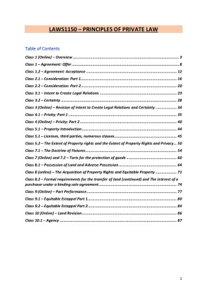 This is a FULL SET of Principles of Private Laws notes from trimester 3 2020. I received a mark of 89 for the course and my lecture was Ross Caruthers (really great and knowledgable lecturer). This also includes all online module readings and futher tips for both the mid-term assessment and the final exam. The topics include: Class 1 - (Online) – Overview Class 1 – Agreement: Offer Class – Agreement: Acceptance Class – Consideration: Part 1 Class – Consideration: Part 2 Class 2 (online) – Revision of Offer, Acceptance and Consideration Class – Intent to Create Legal Relations Class – Certainty Class 3 (Online) – Revision of Intent to Create Legal Relations and Certainty Class – Privity: Part 1 Class 4 (Online) – Privity: Part 2 Class – Property Introduction Class – Licenses, third parties, numerous clauses Class – The Extent of Property rights and the Extent of Property Rights and Privacy Class – The Doctrine of Fixtures Class 7 (Online) and – Torts for the protection of goods Class – Possession of Land and Adverse Possession Class 8 (online) – The Acquisition of Property Rights and Equitable Property Class – Formal requirements for the transfer of land (continued) and The interest of a purchaser under a binding sale agreement Class 9 (Online) – Part Performance Class – Equitable Estoppel Part 1 Class – Equitable Estoppel Part 2 Class 10 (Online) – Land Revision Class – Agency