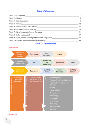 These are well-condensed but detailed notes on each topic to help prepare for final exams and complement your study for Entrepreneurial Marketing at University of Technology Sydney. The following notes contain diagrams and information to help clearly understand Entrepreneurial Marketing 24212 and includes notes from all lectures, tutorials and THE TEXTBOOK. Specifically, the following topics are covered: Week 1 – Introduction Week 2 – Neofect Week 3 – Idea Generation Week 4 – Pricing Week 5 – Public Relation for Ventures Week 6 – Promotion and Advertising Week 7 – Distribution and Channel Decisions Week 8 – Sales Management Week 9 – Sales, Growth Hacking and Customer Acquisition Week 10 – Secure Human and Financial Resources Note: Week 11 & 12 were self revision and therefore not included. Note: The sample notes contain approximately 10% of the complete notes.