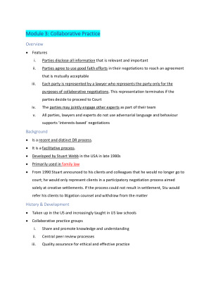 HD notes compiled for Victoria University's ADR unit. Includes summaries and examinable material on the following modules: Module 1: Overview Module 2: Facilitative ADR Processes Module 3: Collaborative Practice Module 4: Determinative/Advisory ADR Processes Module 5: Skills, Obligations and Enforceability Module 6: Regulation and Practitioner Liability Module 7: Practical Activity Module 8: Court and Out of Court ADR Admissibility Module 9: ADR System Design Module 10: Technology and Future Trends