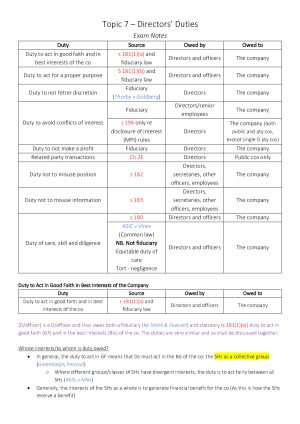 These were my HD (80) Exam Structured Notes for Corporations Law. They are a succinct combination of all the readings, notes and lectures and are in a structured format, which enabled me to answer the questions in the correct and required formats and ultimately achieve an HD. These notes are not only well-structured but also contain helpful scripts to guide exam answers and save time in the exam. They contain exam notes and succinct case summaries for the topics covered, including: - Topic 1 - Introduction to Corporations Law - Topic 2 - Incorporation and its Effects - Topic 3 - The Constitution and Replaceable Rules - Topic 4 - Share (Equity) Capital versus Debt Capital - Topic 5 - Directors, Members and Corporate Decision-Making - Topic 6 - Corporate Contracting - Topic 7 - Directors' Duties - Topic 8 - Members' Remedies - Topic 9 - Corporate Morality