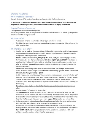 All Lecture Notes and Important Case Notes all comprised into one document. Have this with you all semester for great guidance throughout the whole semester!! Topics included: - Offer and acceptance -Intention to Create Legal Relations -Consideration -Estoppel -Certainty -Express and Implied Terms -Interpretation of Terms -Termination -Restrictions on Termination and Consequences of Termination -Introduction to Remedies