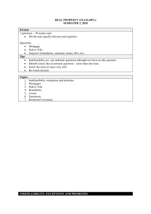 These notes are for LLAW2322 Real Property Law. I obtained a distinction in the topic overall. These notes contained all the detail you need to answer Property Law exam question, and include references to the Real Property Act and relevant case law. I have structured my notes in a way that will help you answer exam questions more easily. Good luck! Topics included: 1. Indefeasibility, exceptions and priorities 2. Mortgages 3. Native Title 4. Boundaries 5. Leases 6. Easements 7. Restricted Covenants