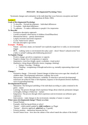 PSYU2235 'Developmental Psychology' notes from lecture 1 to 13. These notes are very detailed, good if you like reading all the lecture notes from one document. Contains: Lecture 1: Introduction Lecture 2: Genes, Environment & Prenatal Development Lecture 3: Infant Development Lecture 4: Piaget's Approach to Cognitive Development Lecture 5: Human Development Lecture 6: Temperament & Emotional Regulation Lecture 7: Parent-Child Attachment & Emotion Regulation Lecture 8: Parenting and the Contemporary Family Lecture 9: Gender Development Lecture 10: Moral Development Lecture 11: Adolescence and Early Adulthood Lecture 12: Adulthood Lecture 13: Death and Dying