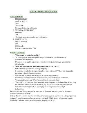 All topics and readings from week 1-12 are covered. This includes: Week 1: Why study inequality? Week 2: The Great Divergence Week 3: Neoliberal Globalization and the Flat World Week 4: Global Slums Week 5: Modern Slavery Week 6: The Precariat and Flexible Labour Market Week 7: Global Cities Week 8: Research Week Week 9: The Transnational Commodification of Care Work Week 10: South-South Cooperation Week 11: Study week Week 12: Re-thinking Piketty Phenomenon
