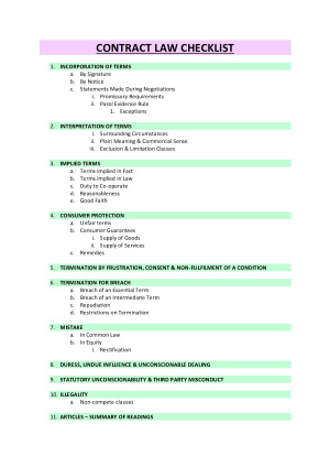 These notes are arranged in a step-by-step checklist format to answer a Contract Law hypothetical question for the JD at Unimelb. It provides detailed case notes, and have hypo introductions for each step which can be copied and pasted directly into the exam to save time. It also has a summary of the readings for the final essay. These notes earned me a high score on the final exam!