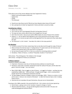 All topics covered in these notes, information gleaned from lectures and seminars attended during Semester Two, 2021 All areas covered in great detail, pretty much all information from the unit is included in these notes. All writing is my own, rewritten following lectures and seminars to allow for a fuller understanding! Topics covered: Everything has a History: What does a historian do? Is history a science? Perspectives History in the Ancient World: Herodotus and Thucydides History as a Science - Ranke, Empiricism The History of the Printing Press and Mass Media Marxism - History as a Revolutionary path Social History and Quantitative History The Feminist Challenge The Death of Truth - post-modernism Oral history Archives - public and Private Contemporary history