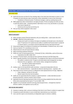 I came in the top three overall in this course. Notes consist of a range of material - audit standard summaries, videos, readings, news articles, class notes Topics covered: 1. An overview of the profession 2. The audit environment 3. Auditor responsibilities 4. Understanding the client and being introduced to risk 5. Analysing financial information to assess risk and define materiality 6. Understanding internal controls and how they influence risk 7. Deciding on the audit strategy 8. Testing internal controls 9. Substantive Testing 10. The future of auditing 11. Audit reporting 12. Tasks at the end of the audit