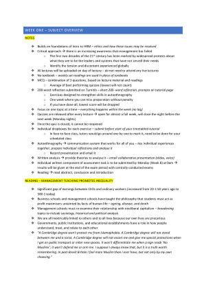 Detailled summary notes for 21407 Strategic HRM - includes notes from classes and lectures, readings, and additional material. Note that tutorial notes only go up until about Week 7 because then classes stopped running for this subject, but there is still other detailled notes for these weeks. Topics covered: 1. Subject Overview 2. An autoethnographic framework 3. History and philosophy of management 4. Society, culture, and identity 5. Organisational violence 6. Gender and sexuality within patriarchy 7. No notes for this week - this week was skipped in the course outline as a self-study week 8. Race within white supremacy 9. Human resource management in a global context 10. The failings of human resource management 11. Subject review 12. Future career paths