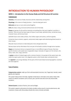 HBS101 Introduction to Human Physiology - La Trobe University 2021 Notes cover content from Week 1 - 12 that were taken from lectures, textbook and study guides. I used these notes to complete the marked quizzes and final short answer question exam. I received a HD for this subject. Content covered includes: Introduction to the Human Body and Systems Introduction to Cell Structure and Function Movement of Molecules Nervous System Homeostasis Endocrine System Muscular System Digestion Metabolism Blood and The Heart Cardiovascular System Immune system Respiratory System Renal System Reproductive System