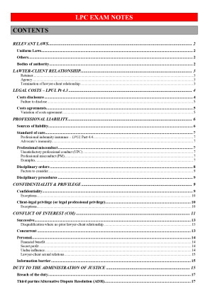 FULL LPC (LEGAL PRACTICE AND CONDUCT) NOTES FOR THE EXAM - Includes all information from lectures, seminars and readings from Wk 1-12 - typed, presented in clear, easy to see format with headings, colour scheme and content page - includes citations to ALL SOURCES, including legislation, cases and more in red so that it's easy to identify - covered all topics on the EXAM, which DOES NOT include: fit and proper person, contingency fees, trust accounting and barrister rules. - click on preview to get an overlook of my style of notes - topics covered: Uniform laws, lawyer-client relationship, legal costs, professional liability, confidentiality and privilege, conflict of interest, duty to the administration of justice, duty to third parties - all made by an A-grade student
