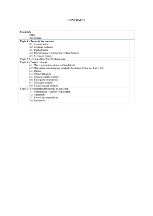 Easy to follow, step-by-step guide to answering final exam problem questions. Topics include: Essentials Offer Acceptance Topic 4 - Terms of the contract : Express terms : Extrinsic evidence : Implied terms : Interpretation/ Construction / Classification : Exclusion clauses Topic - Formalities/Part Performance Topic 6 - Proper consent : Misrepresentation (innocent/fraudulent) : Misleading and deceptive conduct (Australian Consumer Law s 18) : Duress : Undue Influence : Unconscionable conduct : Third party impropriety : Unilateral mistake : Rescission and election Topic 7: Termination/Discharge of contract : Performance / Actions for payment : Agreement : Breach and repudiation : Frustration