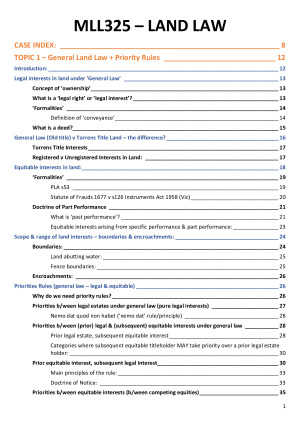 Includes a 'case index' which summarises the main principle/point of each case that was covered in the unit (organised according to topic) Relevant legislation is written in red text, and relevant cases are written in green text for easy identification. Includes table of contents and numbered pages Includes all topics for the unit including: - General land law & priority rules - Electronic conveyancing - The Torrens System & Principle of Indefeasibility - Statutory exceptions to indefeasibility (statutory fraud) - Paramount interests & in personam exception - Inconsistent legislation - Volunteers & State guarantee of title - Unregistered interests & Caveat system - Co-ownership - Severance of a joint tenancy & partition