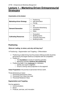 Detailed Entrepreneurial Marketing Management lecture notes - cover all topics with relevant examples and breakdown details from lecture content. Lecture 1 – Marketing-Driven Entrepreneurial Strategies Lecture 3 – Generating, Screening, and Developing Ideas with Marketing Inputs Lecture 4 – Entrepreneurial Pricing Lecture 5 – Public Relations for Start-Up Ventures Lecture 6 – Promotion, Viral Marketing, and Advertising for Start-Up Ventures Lecture 7 – Distribution & Channel Decisions Lecture 8 – Sales Management Lecture 9 – Sales, Growth Hacking and Customer Acquisition Lecture 10 – Marketing for Human and Financial Resources