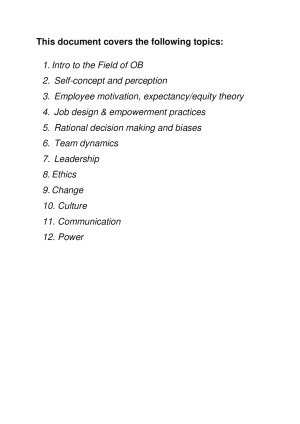 Summary notes for the OB course! Written by a H1 student who did OB over the summer. Topics include: 1. Intro to the Field of OB 2. Self-concept and perception 3. Employee motivation, expectancy/equity theory 4. Job design & empowerment practices 5. Rational decision making and biases 6. Team dynamics 7. Leadership 8. Ethics 9. Change 10. Culture 11. Communication 12. Power Case examples are included!