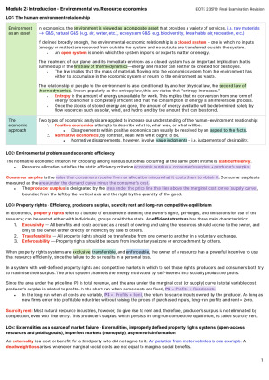 This is a complete summary of the 23570 Economics of the Environment course. It includes notes from lecture slides and the textbook readings (Tietenberg & Lewis, 2018), and each module has been condensed into one double-sided A4 paper (2 pages), although some may be a little longer (3 to 4 pages). This document covers ALL assessable modules: - Module 2: Introduction - Environmental vs. Resource economics - Module 3: Dynamic efficiency and sustainable development - Module 4: Depletable resource allocation - Module 5: The transition from depletable to renewable resources - Module 6: Water - Module 7: Economics of pollution control - Module 8: Climate change - Module 9: Land usage - Module 10: Common-pool resources - Module 11: The quest for sustainable development These notes have been formatted according to the following key: - Red: Definitions - Royal blue: Examples - Purple: Practical applications - Turquoise: Key theorists - Highlighting is generally used to visually divide concepts when they are a part of a larger concept, or to more easily distinguish steps in a process.