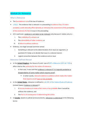 Constructed according to the classes taken by Victoria University, these notes achieved a HD mark and include summaries on the following modules: Module 1: The Uniform Evidence Law Module 2: Competence and Compatibility Module 3: Documentary Evidence/Hearsay Module 4: Statutory Exceptions to Hearsay Module 5: Admissions and Confessions Module 6: Tendency and Coincidence Module 7: UEA/Underpinning Law/Exclusion of Evidence Module 8: Client Legal Privilege Module 9: Character - Opinion Evidence - Burden with standard of Proof Module 10: Revision