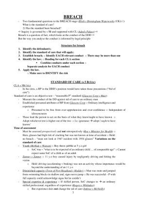 NEGLIGENCE 1. Established duties of care 2. Novel duties of care Doctor & patient Solicitor & client Teacher & student 2) whatever the scope, all DoC are to be discharged by the exercise of reasonable care OMISSIONS Is there an ILLEGALITY or IMMUNITY? – Extension of scope 1) Illegality of a 3rd party 2) Joint illegality of the parties 3) Illegality of the P themselves Advocates immunity NO duty to rescue Police NOVEL FACT SCENARIOS INCREMENTALIST APPROACH ELEMENTS Foreseeability Degree of control Vulnerability of the Plaintiff Coherency of the law Nature of r/ship between D and P (Tame; Annetts) PUBLIC BODIES Section 5AA: exercise of function or decision to exercise does not in of itself create a duty Section 5 W: principles to consider ( relevant to duty but mainly breach) Section 5 X: policy defence ( relevant to breach) MENTAL HARM 1. Is there a recognised psychiatric illness? (CLA s 5 S(1)) 2. What is the type of harm? (s 5 Q) 3. If there is a recognised psychiatric illness - apply the Reasonable Test (s 5 S(1)) For both pure and consequential 4. Provisions of the CLA 2) Secondary victim (2) in respect of pure mental harm, the circumstances of the case include (c) Nature of the r/ship between P and person killed/injured (d) Whether or not pre-existing relationship between the P and D **NB: if public body and mental harm PURE ECONOMIC LOSS 1. Negligent statements causing economic loss; (NB, other actions MDC under ACL) 2. Negligent acts causing economic loss (“relational economic loss”) Novel fact scenarios BREACH STANDARD OF CARE (s 5 B(1)(c) CLA s 5B(1)(c) BREACH of duty CLA s 5 B -- BREACH REQUIREMENTS Foreseeability (per s 5B(1)(a)) – categorise the risk Risk was not insignificant (s 5B(1)(b)) (a) Probability of harm (b) Likely seriousness of harm (c) Burden of taking precautions Other things (s 5B(2) OBVIOUS and INHERENT risks OCCUPIER’S LIABILITY CAUSATION STRUCTURE ELEMENTS of causation 1) DAMAGE (s 5C(1)) 2) FACTUAL CAUSATION 3) SCOPE OF LIABILITY (“legal causation”) REMOTENESS DEFENCES CONTRIBUTORY NEGLIGENCE Inconvenience Agony of the moment Carelessness of others Causation and remoteness Effect of intoxication Elements of COMMON LAW volenti Volenti – STATUTORY MODICATION OBVIOUS RISKS DANGEROUS RECREATIONAL ACITIVIES ILLEGALITIES AND IMMUNITIES LIABILITY FOR OTHERS VICARIOUS LIABILITY Elements of VL (for employee-employer) Element 1 – WHO IS AN EMPLOYEE? (Nb; no VL for IC) Element 2 – CONNECTION between the ACT of the TF and the R/SHIP with the DD Element 3 – the Act/Omission MUST be WRONGFUL Liability of an employer for the wrongs of an IC PERSONAL LIABILITIES FAILURE TO CONTROL NON-DELEGABLE DUTIES INTENTIONAL TORTS TO THE PERSON TRESPASS: In General Three distinctive characteristics – consider each then go to specifics BATTERY (trespass to person) 4 ELEMENTS TO PROVE ASSAULT ELEMENTS TO PROVE FALSE IMPRISONMENT ELEMENTS TRESPASS TO LAND ELEMENTS Examples of trespass DEFENCES NUISANCE