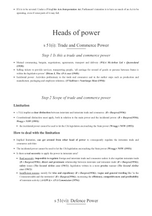 This note will show you how to arrange your answer to the probelm question step by stpe. It is organised in a way especially helpful to answer the problem questions It includes: 1. Characterisation Characterisation Severance and read down 2. Heads of power 51(i): Trade and Commerce 51(vi): Defence Power 51(xxxix): Nationhood Power 51(xxvi): Race Power 51(xx) Corporation Power 96 Grants Power 51(ii) Taxation Power 90 Excise Duty 51(xxxi) Compulsory Acquisition of Property 3. Limitations to legislature 92: Freedom of interstate trade Inter-govermental immunities Implied freedom of political communication 109 Inconsistency 117 Immunity from discrimination 116 Freedom of Religion It also has an outlined bookmark for each chapter so as to easily navigate you to the right topic