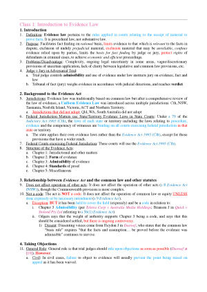 BENEFITS OF MY NOTES - These notes provide you with order and structure in how you approach problem questions. - I have provided PINPOINTS as well having completed the readings and this will give you bonus marks in achieving that HD. - I promise you that these notes will the best set of notes that you will ever receive. I spent hundreds of hours perfecting these notes into these notes and cutting it. - This is what makes these sets of notes well worth the investment. Once you buy it I promise you that you will understand. LEGEND - Light Blue = Key principles - Pink = Case Names - Dark Blue = Legislation - Red / Bold = Anything Key to Note - Also sections to indicate where you put in analysis Topics 1. Introduction 2. Relevance 3. Proof I 4. Adversarial Trial 5. Adducing Evideknce 6. Credibility 7. Hearsay 8. Tendency and Coincidence 9. Character of Accused 10. Opinion Evidence 11. Identification Evidence 12. Discretions to Exclude 13. Admissions and Privielge 14. Proof