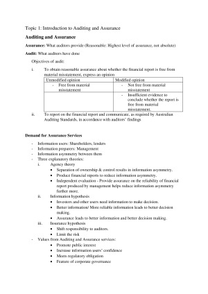Useful, yet concise notes that summarize lecture slides, prescribed textbook reading and notes taken during lecture. I used this lecture notes and tutorial to do revision for final exam. Hope this lecture notes can help you to improve your understanding and achieve H1! Topic covered: (1) Introduction to Auditing and Assurance (2) Professional Role, Ethics, and Legal Liability (3) Audit Planning - Client Acceptance and Continuance (4) Audit Planning - Risk Assessment Part 1 & 2 (5) Audit Planning - Audit Evidence (6) Risk Response - Test of Controls and Sampling (7) Audit Execution - Substantive Procedures (8) Substantive Procedures: Balance Sheet Accounts (9) Substantive Procedures: Income Statement Accounts (10) Audit Conclusion - Completing the Audit (11) Audit Conclusion - Audit Report