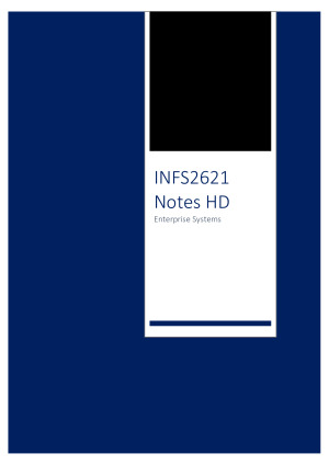 Comprehensive and detailed INFS2621 notes (HD mark of 85). It covers content from all weeks, course readings, examples, tutorials and lectures. Topics Covered: - Week 1: Enterprise Systems - Week 2: Vendor Selection - Week 3: ES Architecture - Week 4: Data and Integration - Week 5: Supply Chain Management - Week 7: Enterprise System Implementation - Week 8: ES Measurement and Post Go-Live - Week 9: Extended Enterprise Systems - Week 10: Enterprise Systems and Analytics *Please note that images were taken out due to StudentVIP's copyright and IP policy.