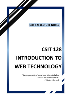 This is a comprehensive notes that covers all the contents from lectures. As you can see in the sample notes, my notes included many technical and practical coding examples, with the screenshots of results displayed in the browser. Also, you can use the clickable table of contents to go to a specific lecture without having to scroll up and down every time. There is no prescribed textbook for this subject so these notes really helped me a lot in achieving a HD in the final exam. List of topics covered: Lecture 1 - HTML Lecture 2 - CSS Lecture 3 - Basics of JavaScript Lecture 4 - Web Form Lecture 5 - Dynamic Documents and Animation with JavaScript Lecture 6 - XML and DTD Lecture 7 - XSD Lecture 8 - XSLT Lecture 9 - JSON Lecture 10 - AJAX Lecture 11 - Graphic Canvas, Drag and Drop Lecture 12 - Local Storage