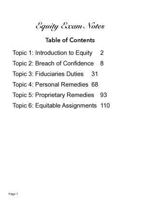 Exam Topics: Topic 1: Introduction to Equity Topic 2: Breach of Confidence Topic 3: Breach of Fiduciary Duty/Third Party Liability Topic 4: Personal Remedies Topic 5: Proprietary Remedies Topic 6: Equitable Assignment These complete notes contain model responses with fill in the blanks (for effective case analogising) and step by step guides with easy to follow headings and subheadings. Diagrams are included to assist in understanding the content and red flags to assist with issue spotting.
