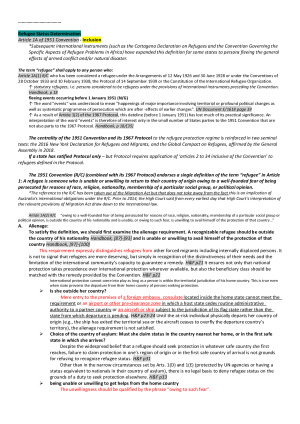 This note served me well in the final exam and got me a H1. This note is structured to help tackle the exam questions. At the same time, it covers all of the topics discussed in the readings, textbook, pre-class recordings and tutorials no matter how trival the topics are, as long as they're examinable. IMPORTANT: This note contains my sample answers to some questions that may appear in the final exam in similar forms (because the past exams questions are all similar). Please DO NOT copy this note in your exam (to avoid Plagiarism). Paraphrase it and add your own understandings! This note does not list the table of contents at the beginning. I list the covered topics here for reference: 1. Refugee Convention History Regional Instruments relating to Refugees Principles of treaty interpretation 2. Refugee Status Determination - International Level Inclusion Clause Alienage Well-founded fear of being persecuted Persecution * Internal Protection Alternative issue * Modification or Concealment issue The Nexus Requirement * The principle of family unit Exclusion Clause * Bogus(forged) document issue Cessation Clause 3. Refugee Status Determination - Domestic Level Source of power History Australia Humanitarian Program Application Process (of refugee status) * Detention issue - end of detention? - alternatives to detention? * Legal Counsel issue * Shared Duty of Fact-Finding * TPV issue Fast track assessment process Appeal Process * Credibility Assessment issue * Tension between the court and the executive (and the legislature) Offshore component of the Australia Humanitarian Program (resettlement) Onshore component of the Humanitarian Program #Up to 5th December 2014 4. Protection if domestically recognized as refugee Obligations/Responsibilities of 'Refugee' Rights of 'refugees' * Right to work issue 5. Protection if the refugee application was rejected / the refugee status was not domestically recognized Non-refoulement issue The complementary protection International Level Protection * Asylum Issue * Interpretation Issue * Sovereignty Issue * Burden of Proof Issue * Legal Assistance Issue * Which mistake is worse: to deny a refugee claim that should have been granted, or to grant a claim that should have been denied * Inconsistency between domestic obligations and international requirements 6. Responsibility sharing/shifting schemes at international law Sources Constraints on P/E policies * Malaysia Solution issue BTW This subject was taught by Michelle Foster and she is a great teacher. I have read many of her papers during this subject and think they are very helpful. If you are taking her classes, just enjoy and you won't regret it. Thank you!