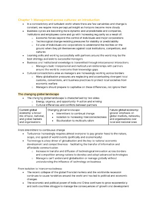 Complete notes from weeks 1-10. Topics covered: - Management across cultures: an introduction - Global managers: challenges and responsibilities - Cultural environments - Communicating across cultures - Leading global organisations - Negotiating global partnerships - Managing ethical conflicts - Managing global teams - Managing global assignments