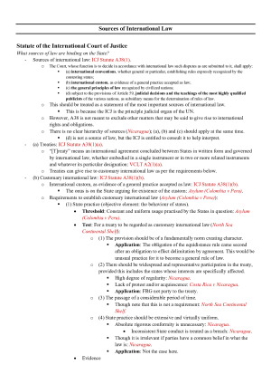 Comprehensive notes for the entire subject formatted in a scaffold. Cases are integrated into the notes as this is an exam. Covers all topics assessed: Nature of PIL Sources of International Law Law of Treaties PIL and Municipal Law Personality, Statehood and Self-Determination Title to Territory State Jurisdiction Immunity from Jurisdiction State Responsibility Use of Force Implementation, Enforcement and Accountability