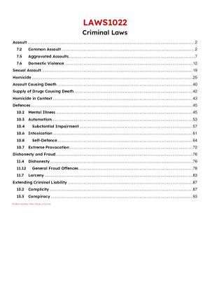 Concise/detailed (depending on what is more helpful for each topic) notes on all LAWS1022 content. You can use these to understand the topics, guide yourself through the readings, for class participation. Later on, you can use the problem question flow charts (at the end of the document) to practice doing problems and learning/memorising the important principles (make sure to do practice questions!!) :) List of Topics: Assault Sexual Assault Homicide Assault Causing Death Supply of Drugs Causing Death Homicide in Context Defences Dishonesty and Fraud Extending Criminal Liability Note: I didn't include my notes for the Sentencing Assignment because, to be honest, just copy down every word from the modules into a document (but understand it all, of course, don't just passively copy), go through the modules multiple times and go through that big document when doing the assignment to make sure you don't miss a thing (I did this and got 90% for the assignment). Best of luck, this was my fave subject by far and it's super interesting :) xx