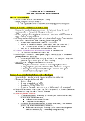 These concise lecture by lecture notes provide a succinct, yet equally sufficient set of notes suitable for MST and Exam revision. I created these notes prior to my GENE30005 Exam and they were highly effective as a revision tool. These notes cover the following modules: Module 1 - Defining and studying traits Module 2 - Development and Cancer: Genetic regulation of cells Module 3 - Modern human genomics Module 4 - Human genetic diseases Module 5 - Sex determination and epigenetics