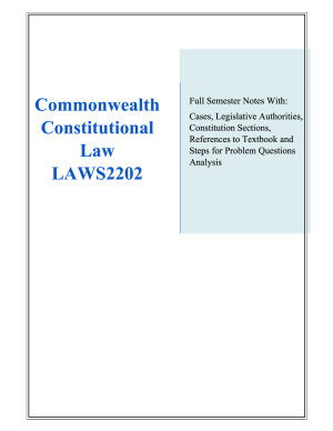 Colour Coded Full Semester Notes With: Cases, Legislative Authorities, Constitution Sections, References to Textbook and Steps for Problem Questions Analysis Topics Include Wks 1-12: For Every Head of Power Check that the Legislation does not attempt to rise higher than its source: Implied free communication on political matters Corporation Power s 51(xx) External Affairs s51(xxix) Races Power s 51(xxvi) Aliens Power Section s51(xix) Taxation s51(ii) Spending s83 Nationhood Power s61 Intergovernmental Immunities Implied Freedom of Political Communication Adequate in its balance Calibrated scrutiny Case Summaries s92 Freedom of Interstate Trade, Commerce and Intercourse