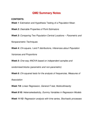 COMPLETE QM2 Summary Notes for the entire course - written by a H1 student (score 93), completed Sem 2 2021. These notes cover the following topics: - Week 1: Estimation and Hypothesis Testing of a Population Mean - Week 2: Desirable Properties of Point Estimators - Week 3: Comparing Two Population Central Locations – Parametric and Nonparametric Techniques - Week 4: Chi-square, t and F distributions, Inferences about Population Variances and Proportions - Week 5: One-way ANOVA based on independent samples and randomised blocks (parametric and non-parametric) - Week 6: Chi-squared tests for the analysis of frequencies, Measures of Association - Week 7/8: Linear Regression, General F-test, Multicollinearity - Week 9/10: Heteroskedasticity, Dummy Variables in Regression Models - Week 11/12: Regression analysis with time series, Stochastic processes ALL statistical tests and theory in the course included to ensure you ace the exam!