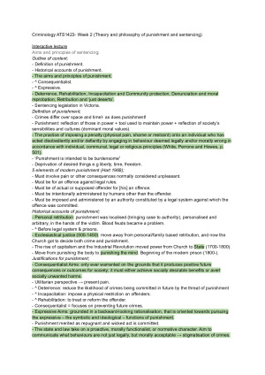 These notes contain all of the required readings, lectures and interactive activities as well as tutorial notes for all of the assessable topics. Week 1: Introduction to subject and unit area Week 2: Theory and philosophy of punishment and sentencing Week 3: Courts, judicial sentencing and sentencing (you be the judge) Week 10: Indigenous people and criminal justice in Australia