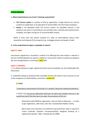 Comprehensive exam answer structures and relevant authority. Topics include: 1. Preliminary considerations; 2. Leasing; 3. Easements; Profits à Prendre; and Restrictive Covenants; 4. Co-ownership; 5. Strata titles; 6. Mortgage; 7. Equitable interests; 8. Priority disputes; 9. Remedies