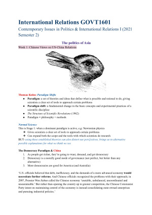 Useful notes on a different topic each week, great revision material for the final exam quiz and mid-semester! Received HD for the final result. Topics: Week 1: Chinese Views on US-China Relations Week 2: A New Cold War? Week 3: Nuclear weapons proliferation: North Korea Week 4: Yemen and the ‘New Wars’ Theory Week 5: Reset, refresh or repeat? Transatlantic relations after Trump Week 6: From BHP in Brazil to the Juukan Gorge: (How) can we hold mining firms to account? Week 7: COVID governance in Aus and NZ Week 8: Essay-writing skills Week 9: Accountability in the Convention on Biological Diversity Week 10: How are American presidents elected and how much power do they have Week 11: What do American liberals, conservatives, and the alt-right believe? Week 12: Pentecostal Christianity and global politics