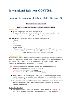 Tutorial questions from each week are also included! Week 2 - International Security Overview Week 3 - International Security: Before and After 9/11 Week 4 - International Security: Terrorism Week 5 - International Organisations: Overview, Theory and Concepts Week 6 - International Organisations Week 7 - Regional organisations Week 8 - International Political Economy overview Week 9 - International Political Economy: The Myth of Neoliberal Globalisation: The Reality of Global Corporate Capitalism Week 10 - Illicit International Political Economy