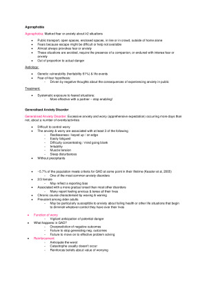 Detailed and concise notes, including both lecture slide content and textbook content. For this unit its especially as important to know of the causes, prevalence and treatment of each of the disorders discussed. Theses notes organise them into an easy to read format, I hope they are helpful :) Contents: History of Abnormality Anxiety Disorders Sleep Disorders Mood Disorders Disorders of Childhood Personality Disorders Body Image and Eating Disorders Disorder of Late Life Obsessive-Compulsive and Trauma Related Disorders Schizophrenia Substance-Related Disorders Sexual Disorders, Paraphilias and Gender Dysphoria